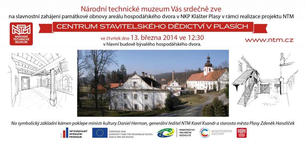 Slavnostní akt zahájení památkové obnovy v rámci projektu NTM „Centrum stavitelského dědictví v Plasích – zahájení stavby II. etapy“. se koná ve čtvrtek dne 13. března 2014 ve 12:30 v hlavní budově bývalého hospodářského dvora. Na symbolický základní kámen poklepe ministr kultury Daniel Herman, generální ředitel NTM Karel Ksandr a starosta města Plasy Zdeněk Hanzlíček.