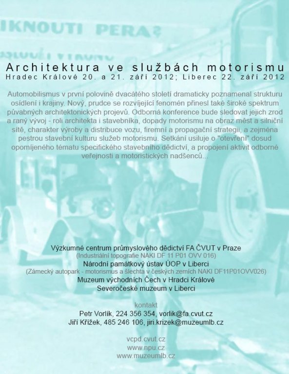 Automobilismus v první polovině dvacátého století dramaticky poznamenal strukturu osídlení i krajiny. Nový, prudce se rozvíjející fenomén přinesl také široké spektrum půvabných architektonických projevů. Odborná konference bude sledovat jejich zrod a raný vývoj - roli architekta i stavebníka, dopady motorismu na obraz měst a silniční sítě, charakter výroby a distribuce vozu, firemní a propagační strategii, a zejména pestrou stavební kulturu služeb motorismu. Setkání usiluje o "otevření" dosud opomíjeného tématu specifického stavebního dědictví, a propojení aktivit odborné veřejnosti a motoristických nadšenců...