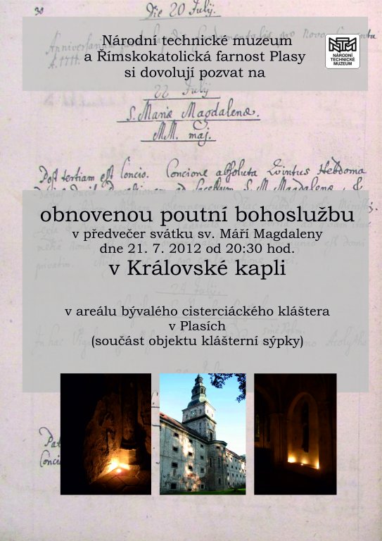 Národní technické muzeum se letos 1. června poprvé připojilo k akci Noc kostelů, a to zpřístupněním tzv. Královské kaple v areálu bývalého cisterciáckého kláštera v Plasích. Další příležitost k večerní návštěvě Královské kaple bude 21. července 2012, kdy zde v předvečer svátku sv. Máří Magdaleny bude poprvé po mnoha desetiletích sloužena poutní mše.