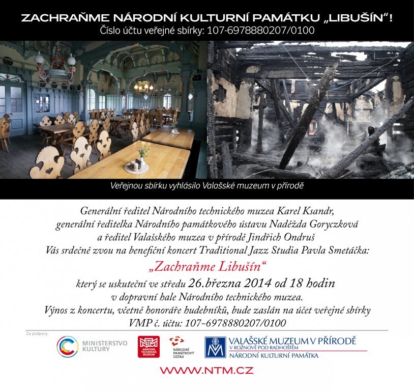 Národní technické muzeum, Národní památkový ústav a Valašské muzeum v přírodě Vás srdečně zvou na benefiční koncert Traditional Jazz Studio Pavla Smetáčka: „ZACHRAŇME LIBUŠÍN“, který se uskuteční ve středu 26. března 2014 od 18 hodin v dopravní hale Národního technického muzea.