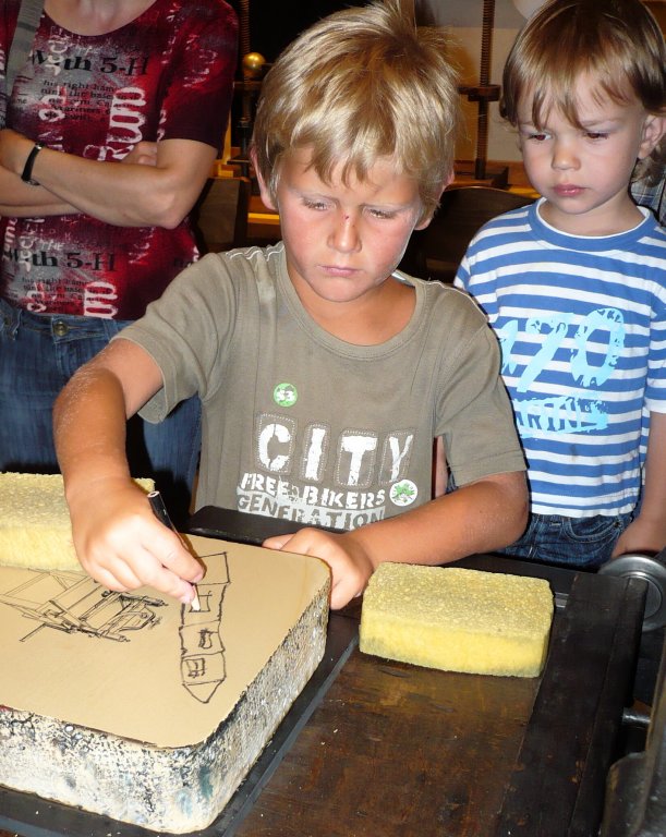 Ukázka tisku originální litografie na stroji vystaveném v expozici Tiskařství. Ukázka bude probíhat od 15 hodin.