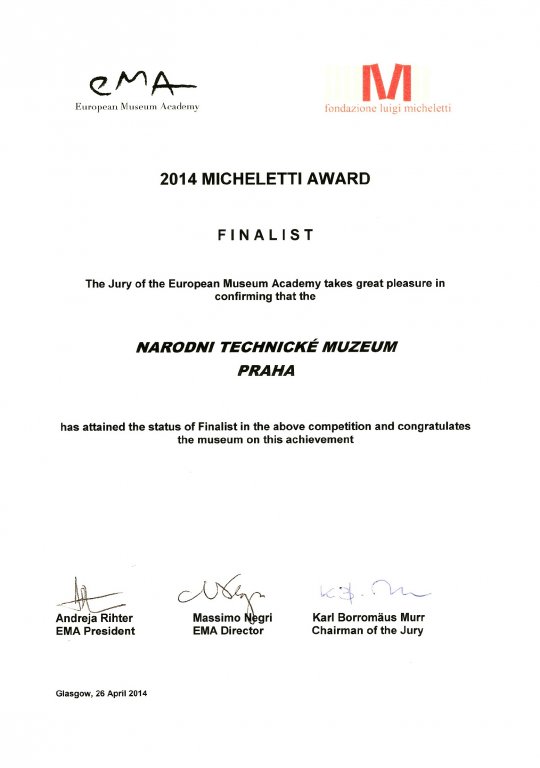 Národní technické muzeum zaznamenalo velký mezinárodní úspěch, po dokončení a vybavení expozicemi v loňském roce bylo nominováno Evropskou muzejní akademií Ema jako jeden z 16 úspěšných muzejních evropských počinů na Michelettiho cenu a postoupilo mezi 6 finalistů. Bylo vysoce hodnoceno paní Dr. Andrejou Richter, prezidentkou Evropské muzejní akademie. Hlavní ocenění a Michelettiho cenu za rok 2014 získalo Museum of Science v Trentu v Itálii, které kromě úspěšných expozic zaujalo i novostavbou od uznávaného architekta.