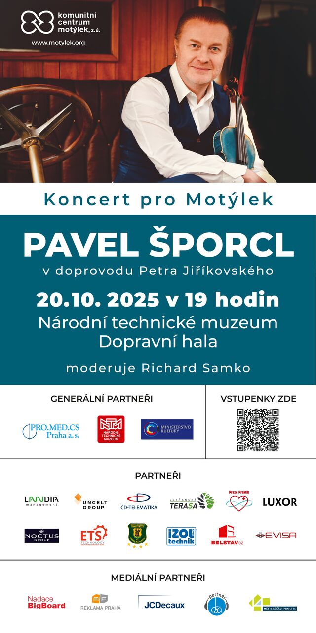 Na pondělí 20. října 2025 zveme do Dopravní haly NTM na benefiční koncert pro Komunitní centrum Motýlek. Zazní „Hudba českých autorů“ v podání Pavla Šporcla a Petra Jiříkovského. K dispozici jsou poslední vstupenky.