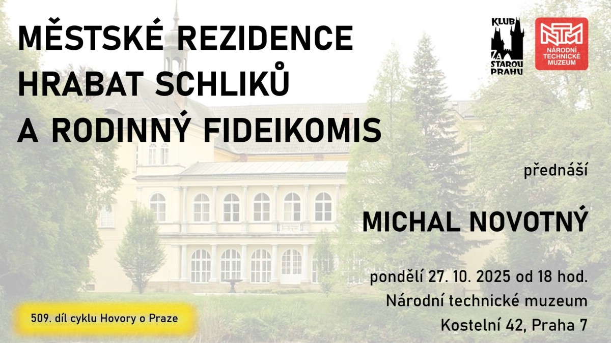 Zveme na 509. Hovory o Praze, které pořádá Klub Za starou Prahu ve spolupráci s NTM. Na téma Městské rezidence hrabat Schliků a rodinný fideikomis promluví Michal Novotný z NTM.