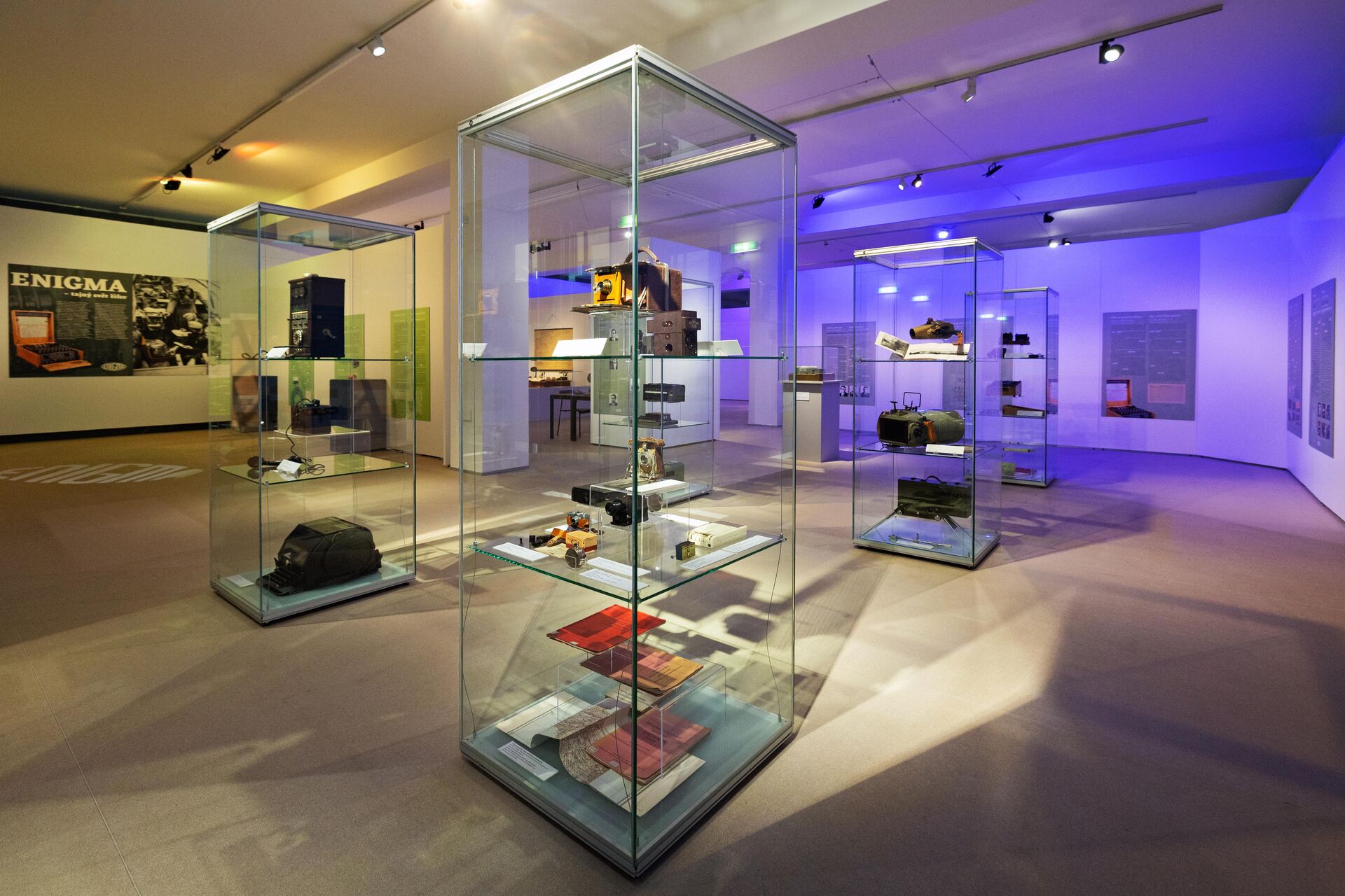 Ve výstavě je kromě zapůjčeného slavného šifrovacího stroje Enigma možné vidět i dva jiné šifrovací stroje ze sbírek NTM, staré špionážní fotoaparáty, zřízení pro letecké snímkování a komunikační techniku. Z utajovaných projektů se návštěvníci mohou seznámit s vývojem nového prototypu motocyklu Jawa, domácích spotřebičů firmy Esa nebo kapesní kalkulačky Curta, které probíhaly za druhé světové války.